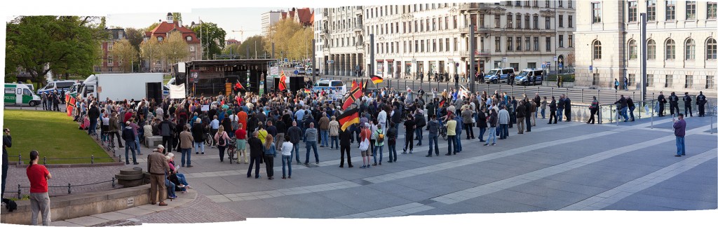 Auf der Auftaktkundgebung schossen wir eine Sequenz von hochauflösenden Bildern, welche in der Auswertung mittels Adobe Photoshop zu einem Panoramabild zusammengesetzt wurden: