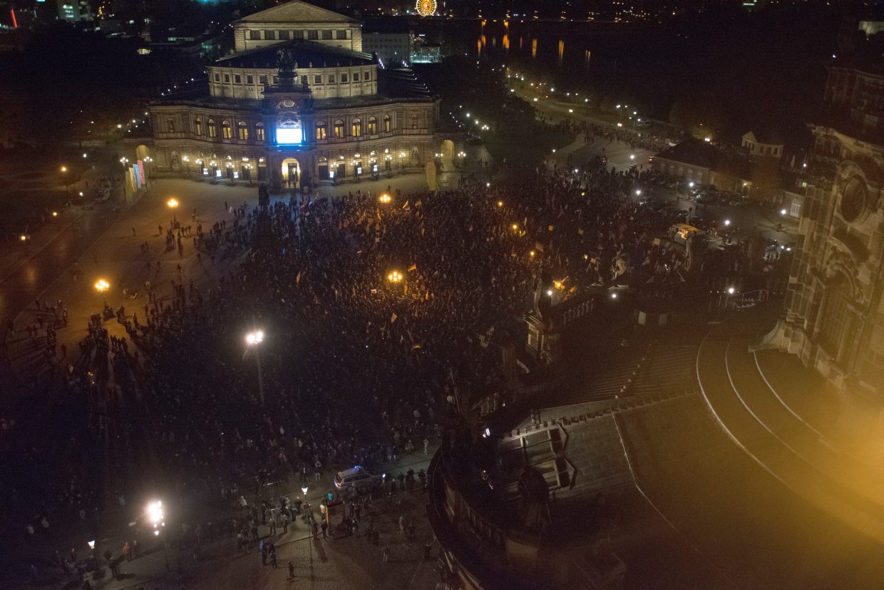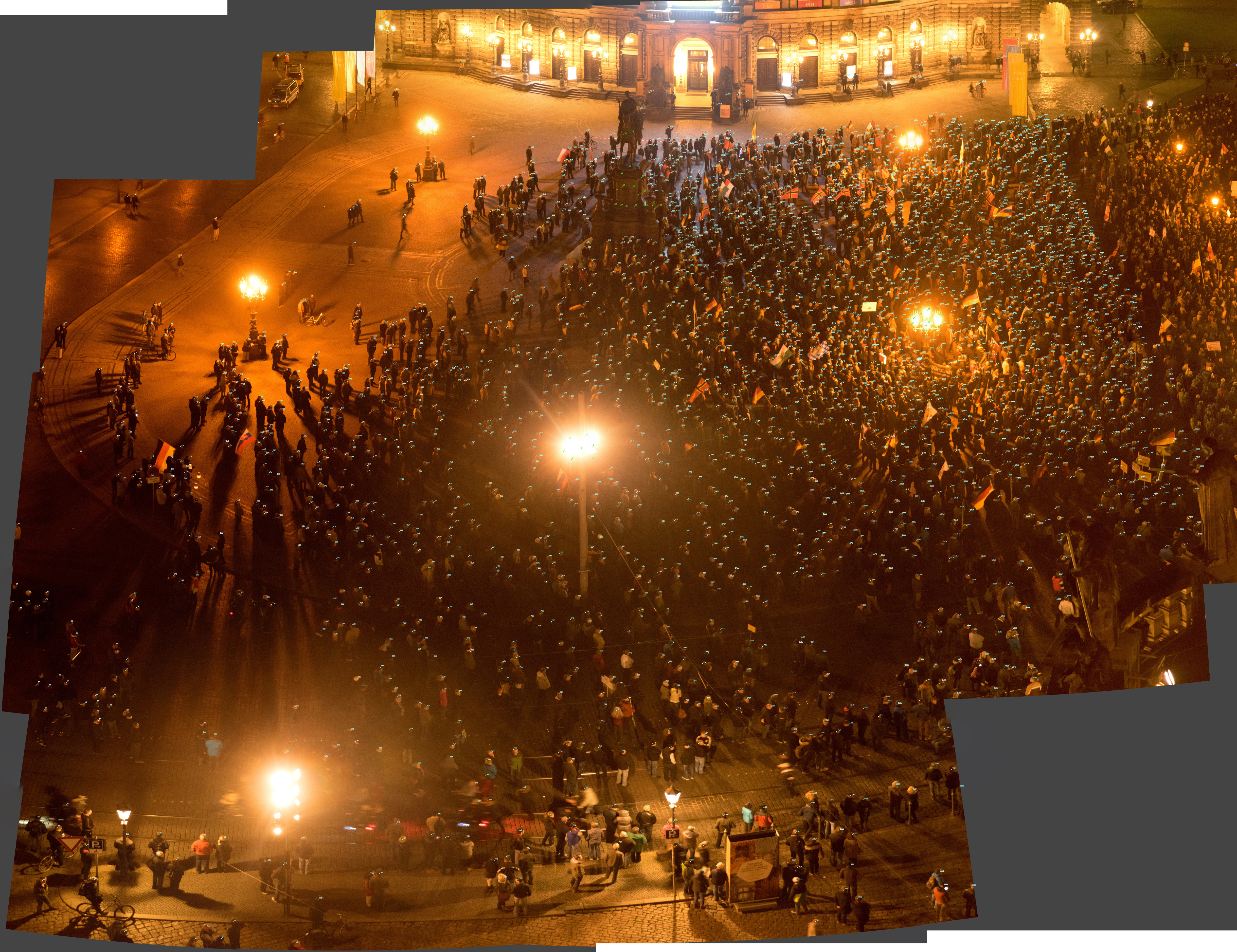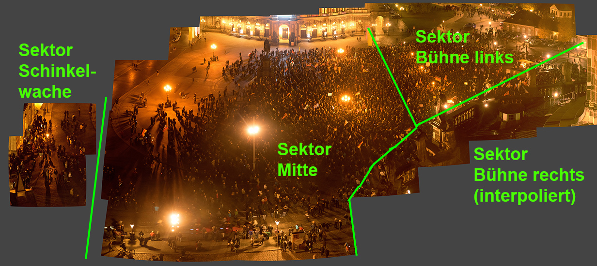 Von 19:00 – 19:15 Uhr wurden vom Hausmannsturm mehrere Bildsequenzen der Veranstaltung aufgenommen. Die wurden anschließend mit dem Programm „Panorama Studio 2 Pro“ zu drei großen Bilder zusammengesetzt. Der Theaterplatz wurde in vier Sektoren unterteilt: Schinkelwache, Mitte, Bühne links und Bühne rechts. Der Sektor rechts der Bühne ist jedoch von dem Turm aus nicht einsehbar. Zunächst wurden die Zahl der Menschen auf diesen Bildern mit dem Zählungswerkzeug von Adobe Photoshop ermittelt. Sofern Verdeckungen durch große Sichthindernisse wie Statuen oder Laternen zu erwarten waren wurde die Zahl der dort zu vermutenden Menschen direkt interpoliert, indem die im umliegenden Bereich auftretenden Punktdichte simuliert wurde. Zudem wurden je nach auftretender Dichte und Bildqualität die Schätzintervalle noch nach oben erweitert, um einzelne, durch Fahnen, Plakate und ähnliche Gegenstände verdeckte Menschen zu berücksichtigen. Damit wurden auch mögliche Fehler durch das Übersehen einzelner Personen einkalkuliert.