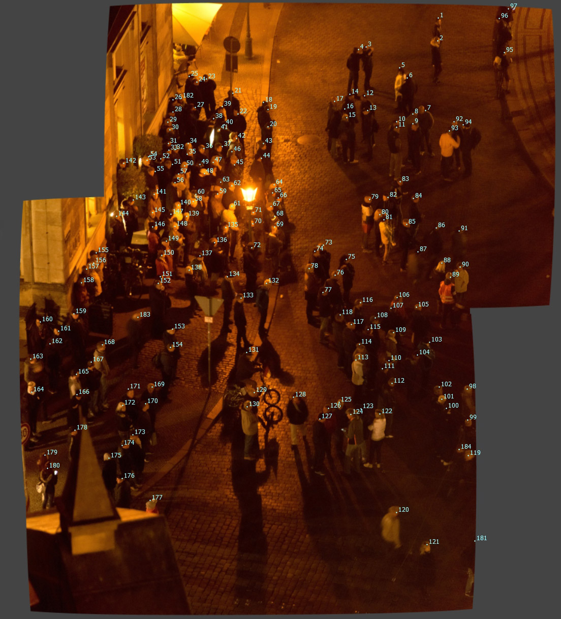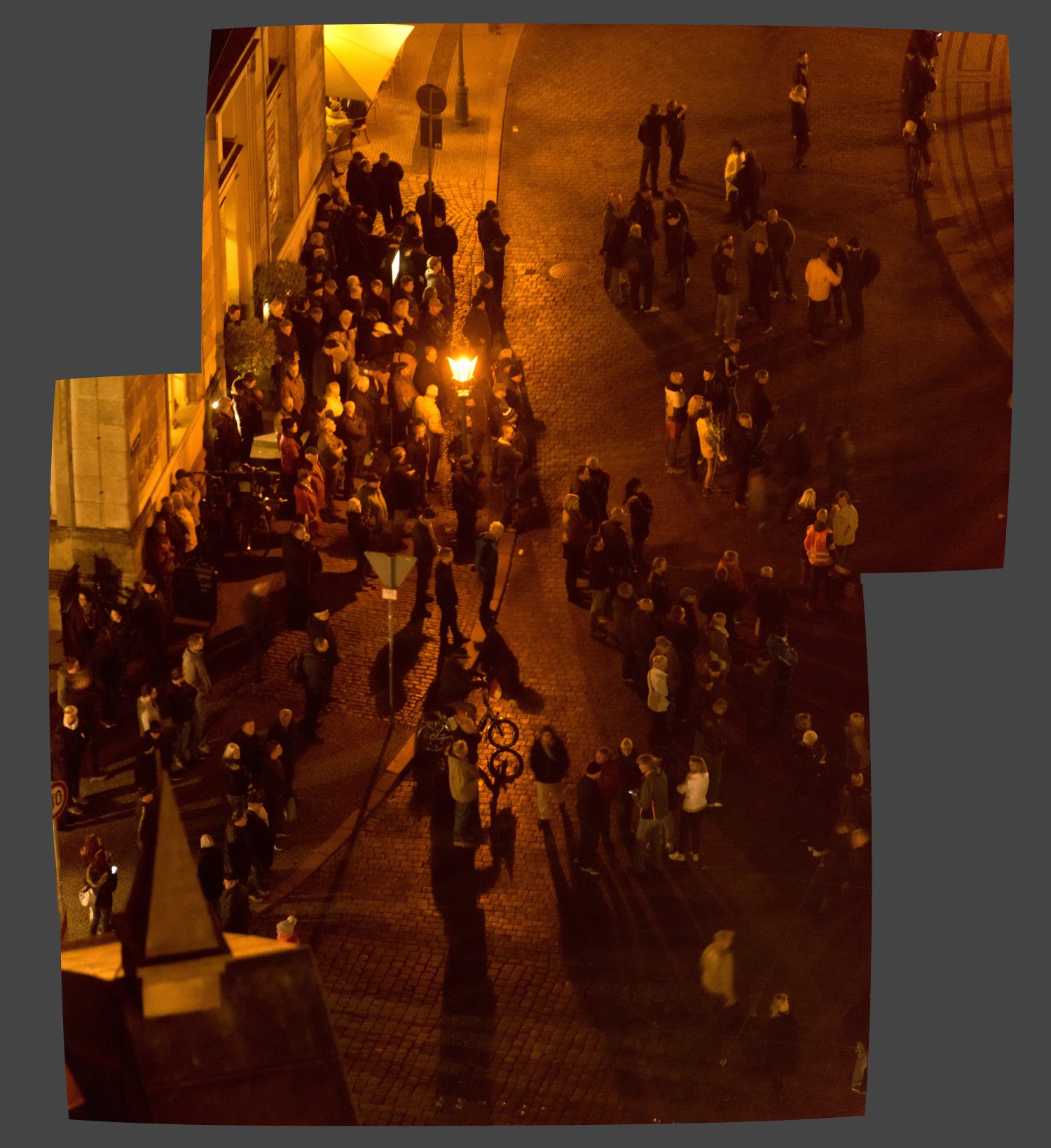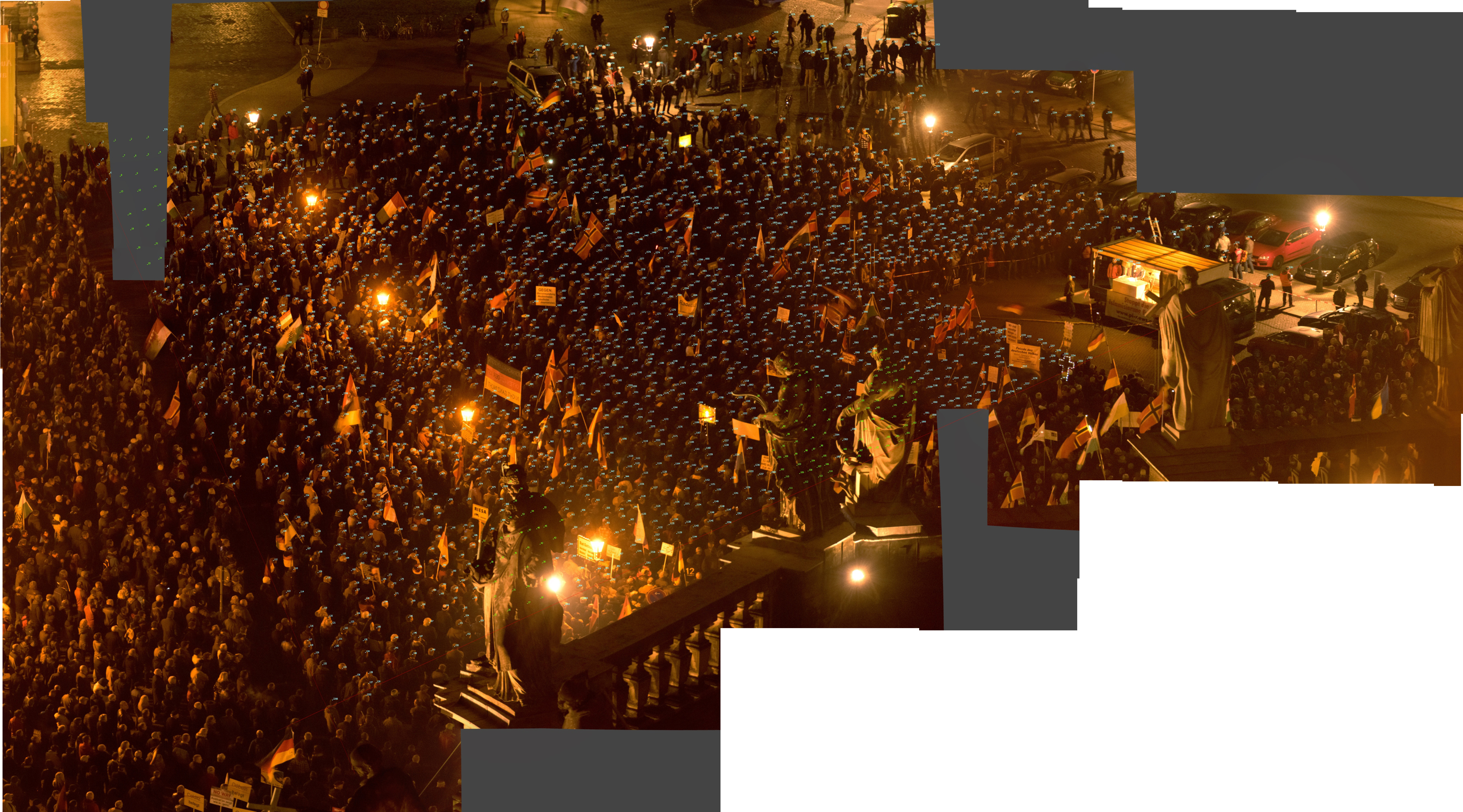 Von 19:00 – 19:15 Uhr wurden vom Hausmannsturm mehrere Bildsequenzen der Veranstaltung aufgenommen. Die wurden anschließend mit dem Programm „Panorama Studio 2 Pro“ zu drei großen Bilder zusammengesetzt. Der Theaterplatz wurde in vier Sektoren unterteilt: Schinkelwache, Mitte, Bühne links und Bühne rechts. Der Sektor rechts der Bühne ist jedoch von dem Turm aus nicht einsehbar. Zunächst wurden die Zahl der Menschen auf diesen Bildern mit dem Zählungswerkzeug von Adobe Photoshop ermittelt. Sofern Verdeckungen durch große Sichthindernisse wie Statuen oder Laternen zu erwarten waren wurde die Zahl der dort zu vermutenden Menschen direkt interpoliert, indem die im umliegenden Bereich auftretenden Punktdichte simuliert wurde. Zudem wurden je nach auftretender Dichte und Bildqualität die Schätzintervalle noch nach oben erweitert, um einzelne, durch Fahnen, Plakate und ähnliche Gegenstände verdeckte Menschen zu berücksichtigen. Damit wurden auch mögliche Fehler durch das Übersehen einzelner Personen einkalkuliert.