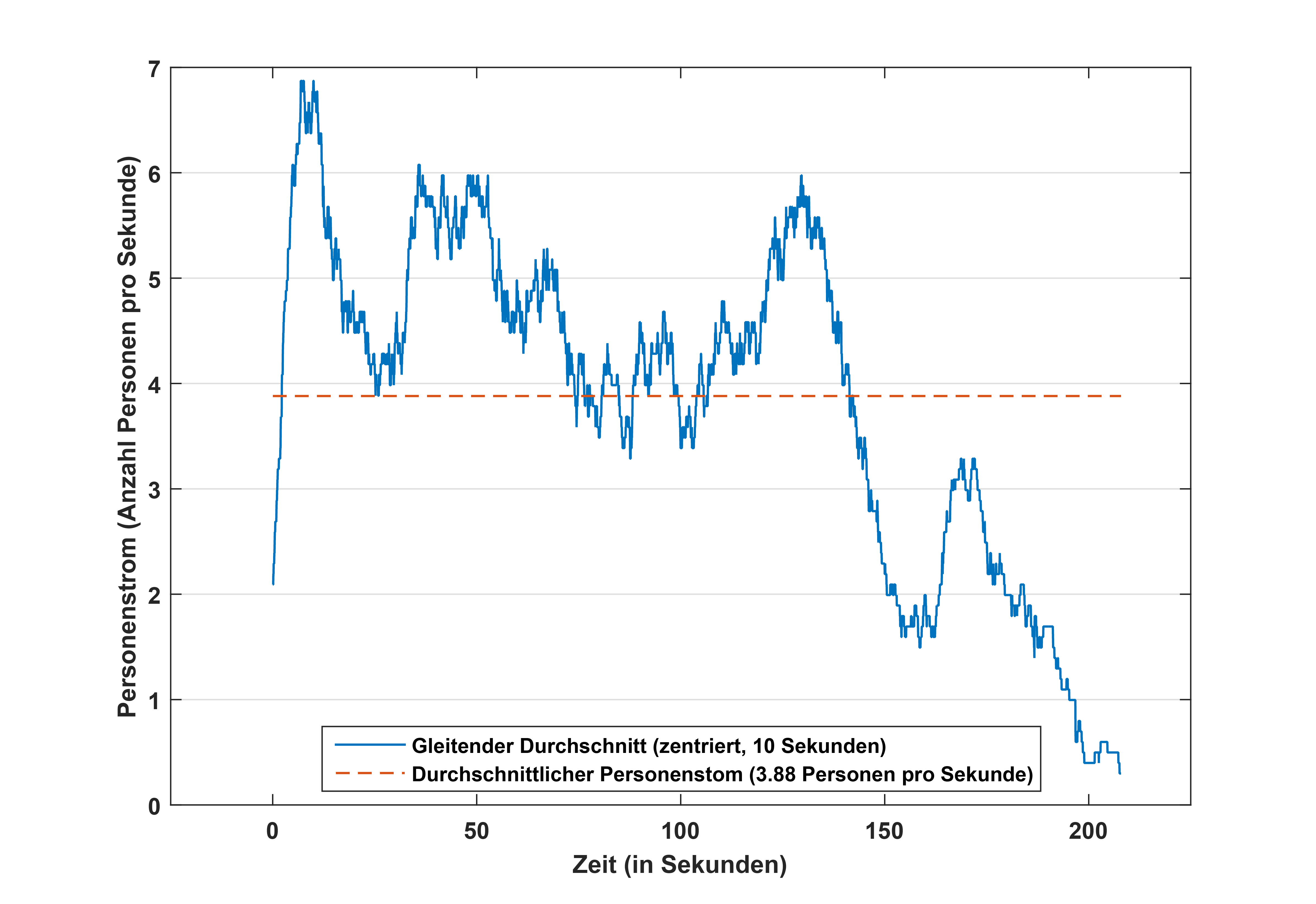 Eine Personenstrom-Analyse der Daten aus dem Video liefert das folgende Diagramm. Damit ergibt sich ein durchschnittlicher Personenstrom von 4.52 Personen pro Sekunde.