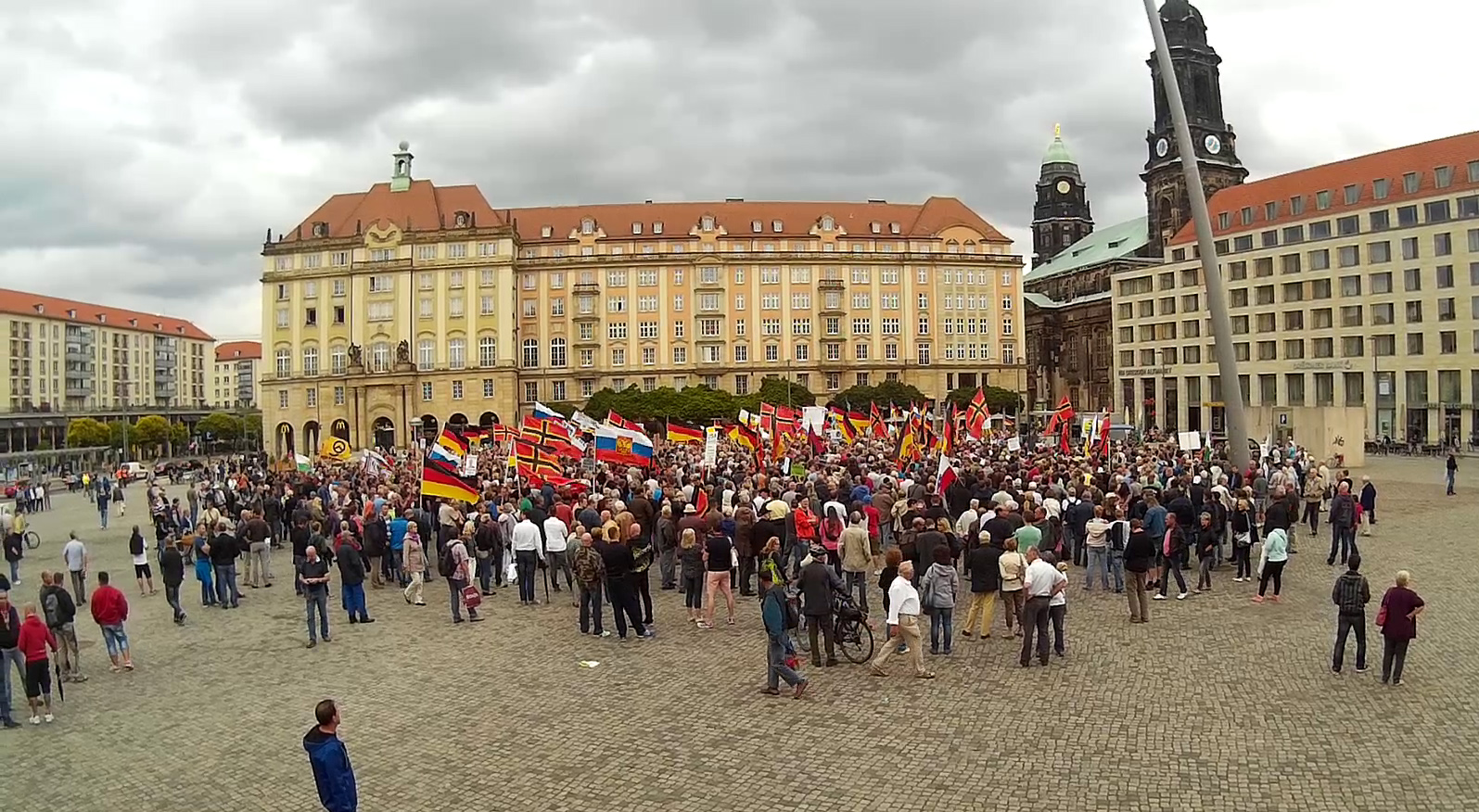 Auch diesen Montag traf sich das Pegida-Bündnis in Dresden zu seiner üblichen Demonstration. Nach der Auftaktkundgebung auf dem Theaterplatz zogen die Teilnehmer der Pegida am Landtag und dem Haus der Presse vorbei. Vor dem Schauspielhaus nahe dem Postplatz wurde das Zählvideo aufgenommen. Der Demonstrationszug kehrte von dort über den Schlossplatz an den Ausgangspunkt zurück.